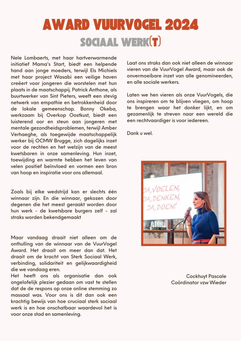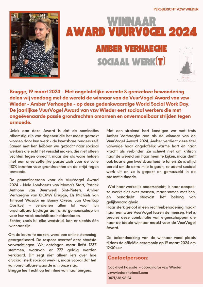 Op World Social Work Day hebben we met ongelooflijke warmte en grenzeloze bewondering de winnaar van de VuurVogel Award 2024 bekendgemaakt: Amber Verhaeghe.