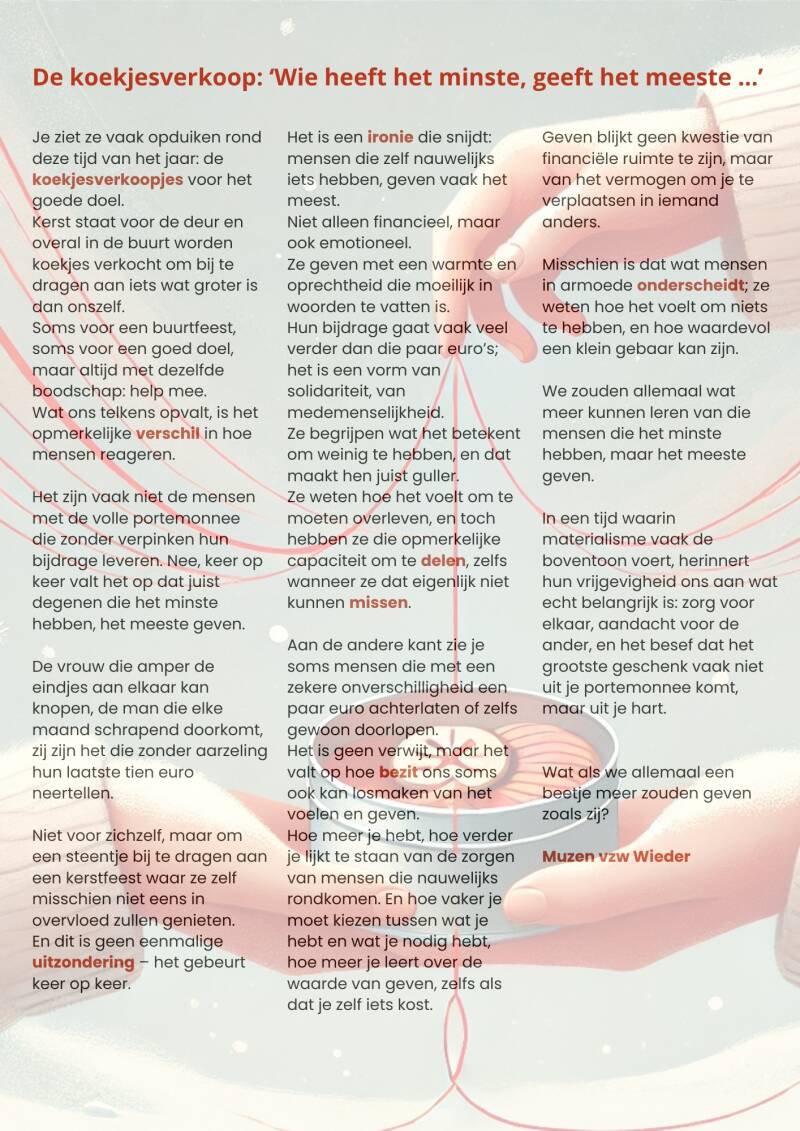 In deze tijd van het jaar zie je overal koekjesverkoopjes en inzamelacties voor het goede doel. Opmerkelijk is hoe vaak het de mensen zijn die zelf weinig hebben, die toch royaal bijdragen — soms met hun laatste paar euro's. Hun gulle gebaar gaat verder dan financiële steun; het is een daad van empathie, verbondenheid, en een reminder aan ons allemaal. Het grootste geschenk komt niet altijd uit je portemonnee, maar uit je hart. ♥️