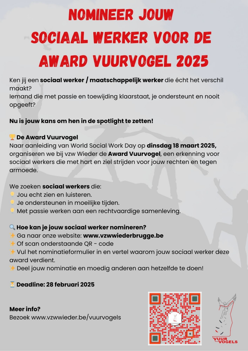 Op dinsdag 18 maart 2025 vieren we World Social Work Day, een dag gewijd aan de ontembare passie en toewijding van sociaal werkers over de hele wereld. En wat is een betere manier om dit te vieren dan met de AWARD VUURVOGEL, georganiseerd door vzw Wieder?